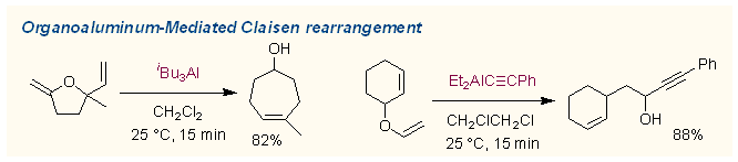 アルミニウムは典型的なLewis酸なので、酸素原子の非共有電子対などが配位します。アルミニウムは配位により電子豊富になるため、アルミニウムに結合している置換基が求核剤として反応することになります。有機アルミニウム化合物はこのようにLewis酸性と(潜在的な)求核性の両方の性質をもっています。脂肪族化合物のClaisen転位反応を行なうには、従来は200゚Cくらいの加熱が必要でしたが、有機アルミニウム化合物を用いると、室温で速やかに進行します。7
