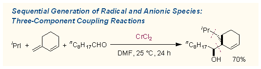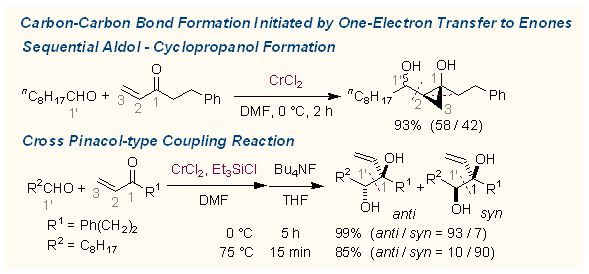 クロムの安定な価数は3であるため、2価のクロムは1電子還元剤として働きます。還元力はマグネシウムや亜鉛金属、サマリウム(II)などほどは強くありませんが、それでも種々の有機化合物を還元し、ラジカルや有機クロム化合物を生成します。それら生じる反応活性種を用いて、炭素−炭素結合を形成する反応を開発しています。3 クロム(II)の還元力が適度な強さであり、また、有機クロム化合物の求核性も強すぎないことから、穏和な条件下で、官能基選択的にアルデヒドなどに付加反応が進行するという特徴があります。