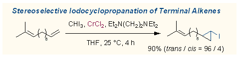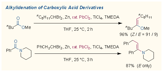 アルデヒドから炭素鎖の1つ長いトランス体のヘテロ原子置換オレフィンを選択的につくりたいことはよくありますが、なかなかよい方法がありません。この反応を用いると、穏和な条件下に目的の変換が行なえます。これらの反応も生理活性物質の合成に用いられています。