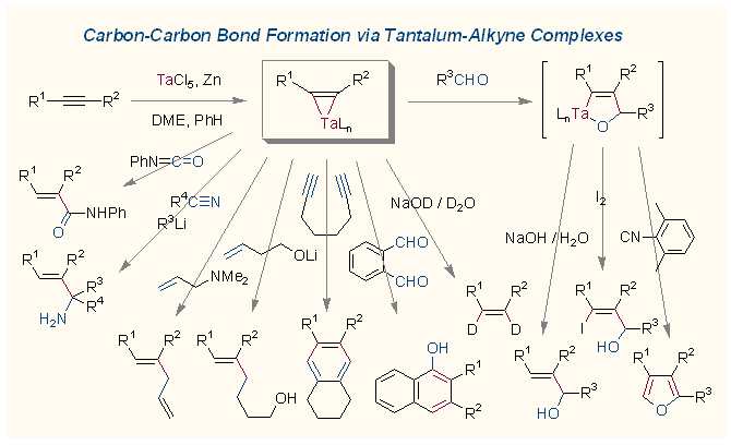 タンタルが周期表のどこにあるかと尋ねられても、すぐにわかる人は少ないかと思います。たしかに、最近コンデンサーなどに使われたりしていますが、まだまだ有機合成にはあまり使われていない金属の1つです。タンタルは5価が安定ですが、亜鉛で還元すると3価になります。溶媒などの条件をうまく設定し、そこへアセチレン(=アルキン)を加えると、タンタルにアセチレンの三重結合が配位したタンタル−アルキン錯体が生成します。タンタル−アルキン錯体のタンタル−炭素結合には種々の不飽和結合が挿入します。そのことを利用すると上図のようなバラエティーに富んだ変換反応を行なうことができます。4