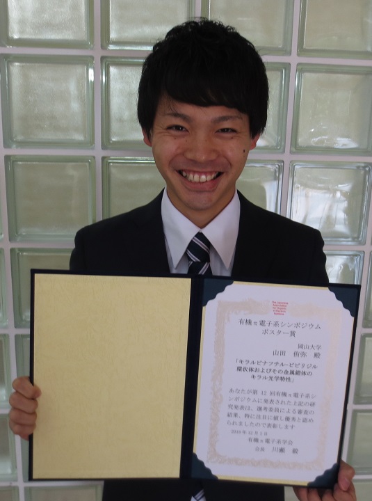 | 第12回有機π電子系シンポジウムにおいて、山田侑弥君(修士課程1年)がポスター賞を受賞しました。 写真 | |