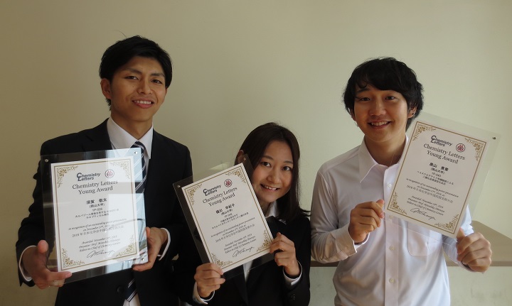 | 2018年日本化学会中国四国支部大会において、樋出早紀子さん(修士課程2年)と奥山貴章君(修士課程2年)と須賀敬太君(修士課程1年)がポスター賞(Chemistry Letters賞)を受賞しました。 写真 | |