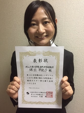| 2011年日本化学会西日本大会において、大林亮子さん(修士課程2年)が優秀ポスター賞を受賞しました。写真 |