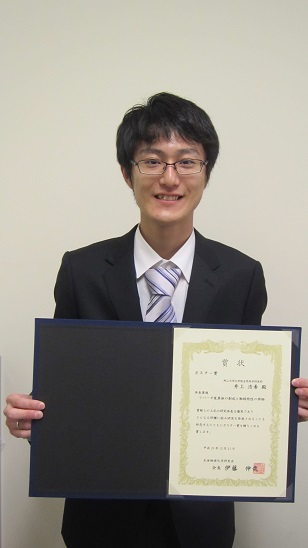 | 日本化学会中国四国支部大会において、安居誠君(修士課程2年)が優秀ポスター賞を受賞しました。 写真 | |