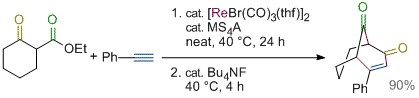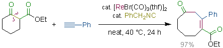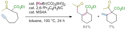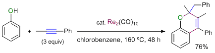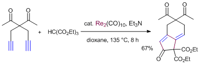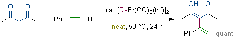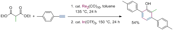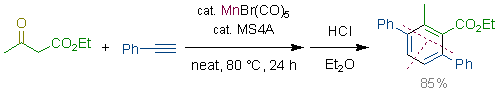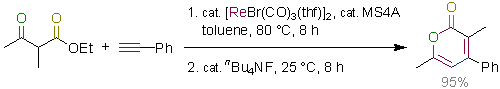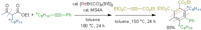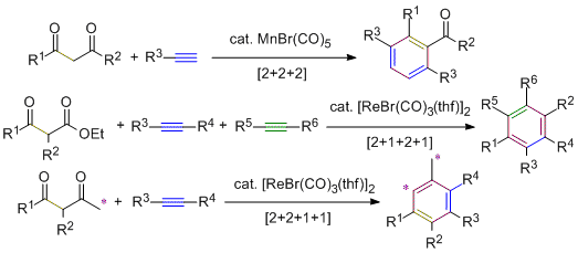Rhenium- and Manganese-Catalyzed Synthesis of Aromatic Compounds from 1,3-Dicarbonyl Compounds and Alkynes. Kuninobu, Y.; Nishi, M.; Kawata, A.; Takata, H.; Hanatani, Y.; Yudha, S. S.; Iwai, A.; Takai, K. J. Org. Chem. 2010, 75 (2), 334-341. (Article) [LINK] Graphical Abstract