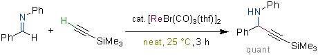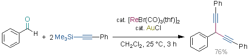 Rhenium and Gold-Catalyzed Coupling of Aromatic Aldehydes with Trimethyl(phenylethynyl)silane: Synthesis of Diethynylmethanes. Kuninobu, Y.; Ishii, E.; Takai, K. Angew. Chem. Int. Ed. 2007, 46 (18), 3296-3299. (Communication) [LINK] Graphical Abstract