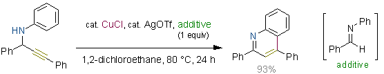 Copper(I) and Gold(I)-Catalyzed Synthesis of 2,4-Disubstituted Quinoline Derivatives from N-Aryl Propargyl Amines. Kuninobu, Y.; Inoue, Y.; Takai, K. Chem. Lett. 2007, 36 (12), 1422-1423. (Communication) [LINK] Graphical Abstract