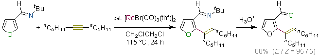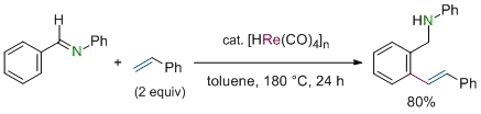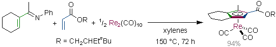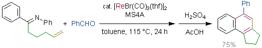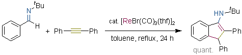Rhenium-Catalyzed Formation of Indene Frameworks via C-H Bond Activation: [3+2] Annulation of Aromatic Aldimines and Acetylenes. Kuninobu, Y.; Kawata, A.; Takai, K. J. Am. Chem. Soc. 2005, 127 (39), 13498-13499. (Communication) [LINK] Graphical Abstract