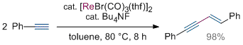 Rhenium-Catalyzed Regio- and Stereoselective Dimerization and Cyclotrimerization of Terminal Alkynes. Kawata, A.; Kuninobu, Y.; Takai, K. Chem. Lett. 2009, 38 (8), 836-837. (Communication) [LINK] Graphical Abstract