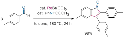 Rhenium- and Manganese-Catalyzed Carbon-Carbon Bond Formation Using 1,3-Dicarbonyl Compounds and Alkynes. Kuninobu, Y.; Kawata, A.; Yudha S. S.; Takata, H.; Nishi, M.; Takai, K. Pure Appl. Chem. 2010, 82 (7), 1491-1501. (Account) [LINK] Rhenium-Catalyzed Synthesis of Indenones by Novel Dehydrative Trimerization of Aryl Aldehydes via C-H Bond Activation. Kuninobu, Y.; Matsuki, T.; Takai, K. Org. Lett. 2010, 12 (13), 2948-2950. (Communication) [LINK] Graphical Abstract