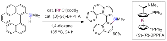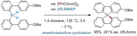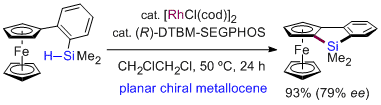 Rhodium-Catalyzed Synthesis of Chiral Spiro-9-silabifluorenes via Dehydrogenative Silylation: Mechanistic Insights into the Construction of Tetraorganosilicon Stereocenters. Murai, M.; Takeuchi, Y.; Yamauchi, K.; Kuninobu, Y.; Takai, K. Chem. Eur. J. 2016, 22 (17), 6048-6058. (Article) =Hot Paper= [LINK] Graphical Abstract