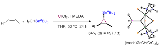 Chromium-Mediated Stannylcyclopropanation of Alkenes with (Diiodomethyl)stannanes. Murai, M.; Taniguchi, R.; Mizuta, C.; Takai, K. Org. Lett. 2019, 21 (8), 2668-2672. (Communication) [LINK] Graphical Abstract