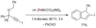 Rhenium-Catalyzed Synthesis of Indene Derivatives via C-H Bond Activation. Kuninobu, Y.; Nishina, Y.; Kawata, A.; Shouho, M.; Takai, K. Pure Appl. Chem. 2008, 80 (5), 1149-1154. (Account) [LINK] Graphical Abstract