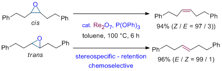 Stereospecific Deoxygenation of Aliphatic Epoxides to Alkenes under Rhenium Catalysis. Nakagiri, T.; Murai, M.; Takai, K. Org. Lett. 2015, 17 (13), 3346-3349. (Communication) [LINK] Graphical Abstract