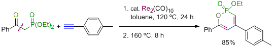 Rhenium-Catalyzed Synthesis of 2H-1,2-Oxaphosphorin 2-Oxides via the Regio- and Stereoselective Addition Reaction of β-Keto Phosphonates with Alkynes. Murai, M.; Nakamura, M.; Takai, K. Org. Lett. 2014, 16 (21), 5784-5787. (Communication) [LINK] Graphical Abstract