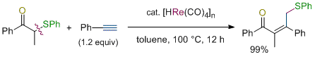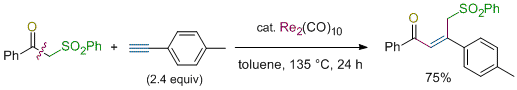 Rhenium-Catalyzed Regio- and Stereoselective Addition of Two Carbon Units to Terminal Alkynes via Carbon-Carbon Bond Cleavage of β-Keto Sulfones. Kuninobu, Y.; Matsuzaki, H.; Nishi, M.; Takai, K. Org. Lett. 2011, 13 (11), 2959-2961. (Communication) [LINK] Graphical Abstract