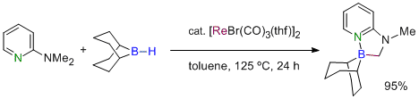 Rhenium-Catalysed Dehydrogenative Borylation of Primary and Secondary C(sp3)-H Bonds Adjacent to a Nitrogen Atom. Murai, M.; Omura, T.; Kuninobu, Y.; Takai, K. Chem. Commun. 2015, 51 (22), 4583-4586. (Communication) [LINK] Graphical Abstract