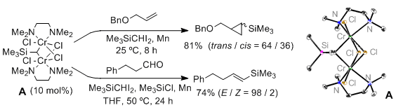 Structural Characterization and Unique Catalytic Performance of Silyl Group-Substituted Geminal Dichromiomethane Complexes Stabilized with a Diamine Ligand. Murai, M.; Taniguchi, R.; Hosokawa, N.; Nishida, Y.; Mimachi, H.; Oshiki, T.; Takai, K. J. Am. Chem. Soc. 2017, 139 (37), 13184-13192. (Article) =Spotlight= [LINK] Graphical Abstract