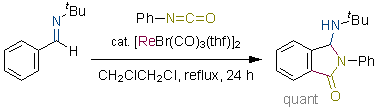 Insertion of Polar and Nonpolar Unsaturated Molecules into Carbon-Rhenium Bonds Generated by C-H Bond Activation: Synthesis of Phthalimidine and Indene Derivatives. Kuninobu, Y.; Tokunaga, Y.; Kawata, A.; Takai, K. J. Am. Chem. Soc. 2006, 128 (1), 202-209. (Article) [LINK] Graphical Abstract