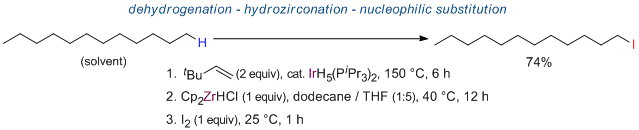 Regioselective Functionalization of Alkanes by Sequential Dehydrogenation-Hydrozirconation. Kuninobu, Y.; Ureshino, T.; Yamamoto, S.-i.; Takai, K. Chem. Commun. 2010, 46 (29), 5310-5312. (Communication) [LINK] Graphical Abstract